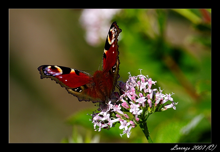 Data : luglio 2007 Canon EOS 350D Autore : Io Ripropongo questa fotografia integrando con alcune note su questa bellissima farfalla. Ordine: Lepidoptera Famiglia: Nymphalidae Genere: Inachis Specie: Inachis Io Nome Comune: Vanessa Io - Occhio di pavone Apertura alare: 5-6 cm Mentre la parte superiore è molto vistosa la parte inferiore è bruno scura con delle linee nero violacee utili per la mimetizzazione. Si trova facilmente vicino all'ortica infatti il bruco si sviluppa su questa pianta ( bruco nero e spinoso ) Lo sfarfallamento avviene tra giugno e luglio La specie è diffusa in tutta Italia dalla pianura fino ai 2500 m. |