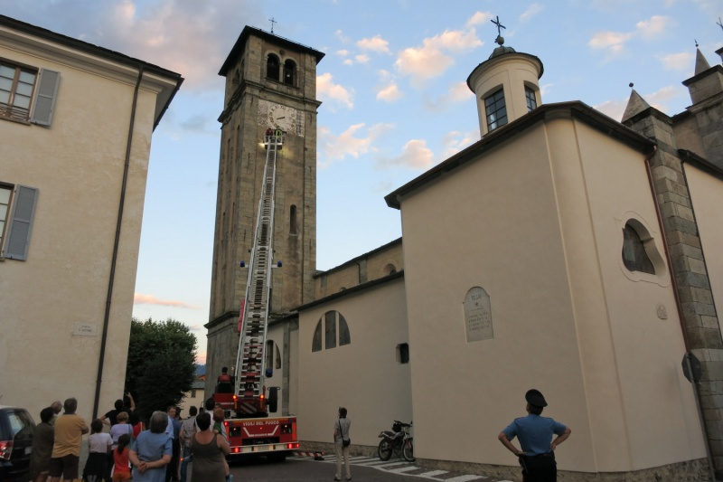 dell’orologio del campanile della collegiata di Santa Eufemia non ci sono più. Sono state tolte durante un intervento, dagli scenari panoramici e dal grande richiamo per la gente del posto e dei villeggianti, avvenuto domenica sera con una squadra dei Vigili del fuoco di Tirano. Intorno alle 20 i pompieri con l’autoscala sono saliti ai 35metri di altezza dell’imponente campanile che dà su piazza Credaro e hanno rimosso le lancette. A dire ilvero una sola delle due - lunghe un metro e 10 centimetri –aveva problemi, ma si è provveduto a togliere entrambe per sicurezza.«Da un po’avevamo notato che l’orologio non funzionava bene – spiega l’arciprete di Teglio, don Flavio Crosta -,ma a 35metri d’altezza non era così semplice vedere e capire cosa non andasse. Poi ci si è accorti che una delle due lancette traballava e così si è deciso di intervenire. La lancetta era in bilico, infatti. Se fosse caduta sarebbe finita sul tetto, non sulla strada, ma comunque era rischioso lasciarla al suo posto in quelle condizioni». Ecco che i Vigili del fuoco, richiamando l’attenzione dei passanti, hanno tolto le due lancette che ora sono nelle mani del parroco, pronto a farle sistemare al più presto. Fortunatamente non si è guastato l’ingranaggio interno,per cui la riparazione non dovrebbe comportare una grossa spesa e neppure l’intervento di una ditta specializzata. Si tratterà di rimettere a posto l’aggancio esterno delle lancette del campanile della chiesa attuale, consacrata nel 1117 e che sorge sul luogo della precedente (secolo VII), ristrutturata nel XV secolo e restaurata in epoche successive. Dunque per un po’ Teglio dovrà stare senza il suo orologio. Domenica sera, a dire il vero, in un clima di serenità, le battute si sprecavano. Proprio don Flavio, che ha instaurato un bellissimo rapporto di amicizia cristiana con i suoi parrocchiani, aveva predicato durante l’omelia che noi fedeli siamo amministratori del tempo e che dobbiamo gestirlo al meglio. Neanche il tempo – giusto appunto - di dirlo che ecco a Teglio le lancette si staccano dall’orologio del campanile. Coincidenza casuale naturalmente,ma per smorzare i toni c’è anche chi ha simpaticamente motteggiato il don che è stato al gioco. (foto di Wildambree) |