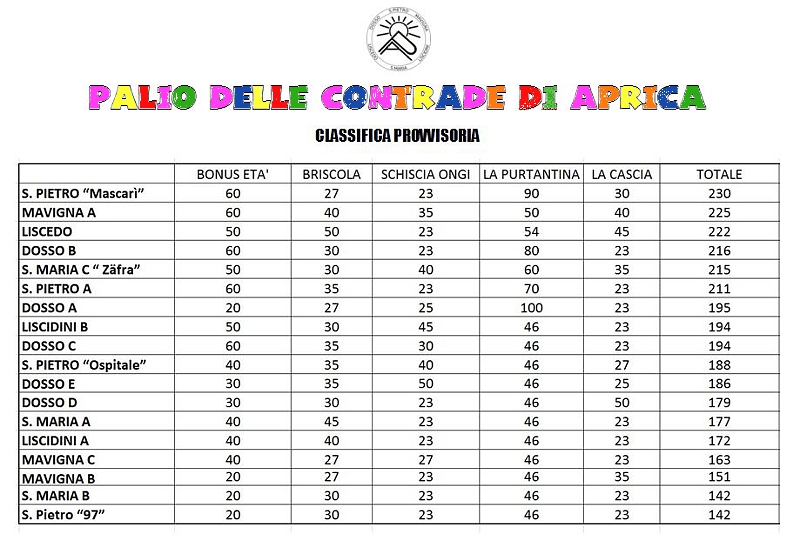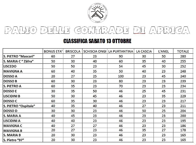 Classifica provvisoria aggiornata ai giochi di sabato 13 ottobre