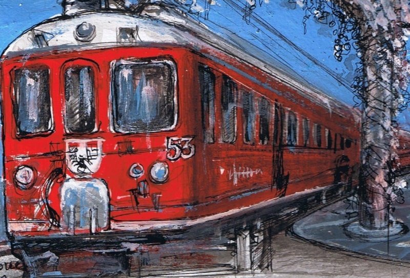 Ascolta: frìuuu ! frìuuu ! Il fischio del trenino rosso del Bernina rimbomba in Valle. Allegria: Il trenino è tornato. Clon ! taclòn ! cloclòn ! Suona la campanella, s’accende le luce rossa al calar delle sbarre, nella quieta attesa del suo gagliardo . ritorno in Tirano. 8 gennaio: malinconica serata dal dì che la rovinosa frana di Brusio tolse il palpito di vita in Piazza delle Stazioni. 17 febbraio: Eccolo arriva. Procede lento e possente, con un fischio saluta festoso, i grappoli di gente in attesa. Beatrice in braccio al nonno, con il ditino all’aria grida: ‘l treno, ‘l treno! Il nonno sussurra: sì, vàrdàl ‘l trenìn rùs l’è turnàa. Poi, uno strider ferroso e subito si quieta in stazione. La gente scende dalle rosse carrozze, indugia sul marciapiede e appare curiosa in Piazza delle Stazioni. Ed ecco fiorir un palpitar di vita nel brusio gioioso della gente. e.m. ( dis. Wilma Del Simone ) |