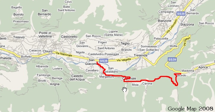 In rosso la strada Aprica - Carona - S.Giacomo aperta nei due sensi di marcia