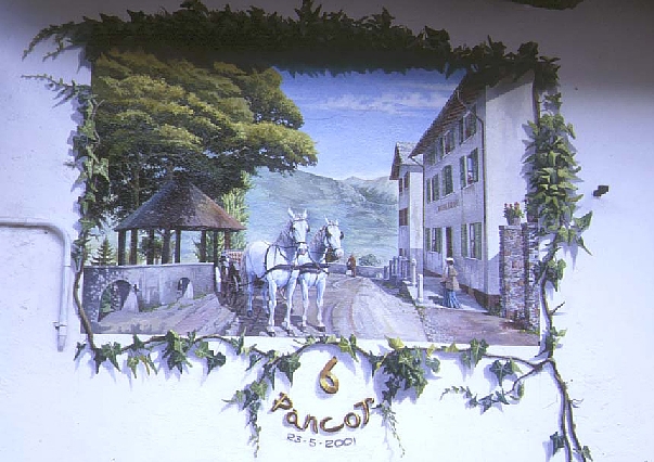 | Racchiuso tra le foglie e i rami di un’edera rampicante, che risale lungo la parete, diramandosi da un ceppo di vera edera, l’opera è la riproduzione fedele di questo luogo molto panoramico. Le figure dei cavalli bianchi, in attesa di ripartire dopo la sosta, dominano la scena. |