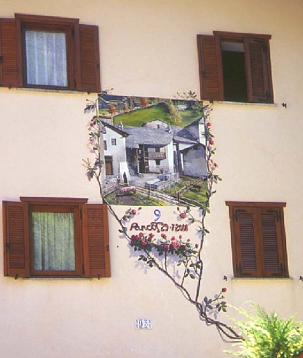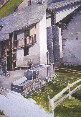 | Alcide Pancòt ha nuovamente utilizzato un elemento naturale per incorniciare il quadro: una rosa selvatica. Il quadro ripropone i classici elementi architettonici tipipici di una contrada di Aprica agli inizi del 1900. Anche i vestiti sono riproduzioni fedeli di quell’epoca. Dagli elementi che compongono l’opera si intuisce lo svolgersi della vita della contrada: una piccola piazza con al centro una fontana a cui attingere acqua, un bene considerato prezioso e che, per questo motivo, meritava una collocazione nel punto più importante. Poi gli animali: altro bene primario, che permetteva di sopravvivere ad una popolazione dedita principalmente all’allevamento. Queste considerazioni non devono tuttavia distogliere dal messaggio che il dipinto ci trasmette: la serenità e la tranquillità della vita in questo luogo, nonostante le piccole e grandi difficoltà che a quei tempi non mancavano. Gente umile e povera, ma ricca di dignità. |